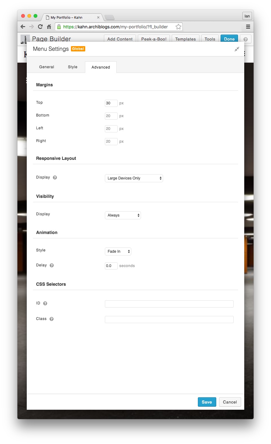 For both the logo and menu, we have set the display options in the advanced tab so that each of these elements only displays on large devices. For mobiles and smaller screens, these elements will clash with the Beaver Builder mobile header settings so it’s best only to show our new logo and menu on larger screens. After all, that’s where we want the full-screen screen design to really shine.